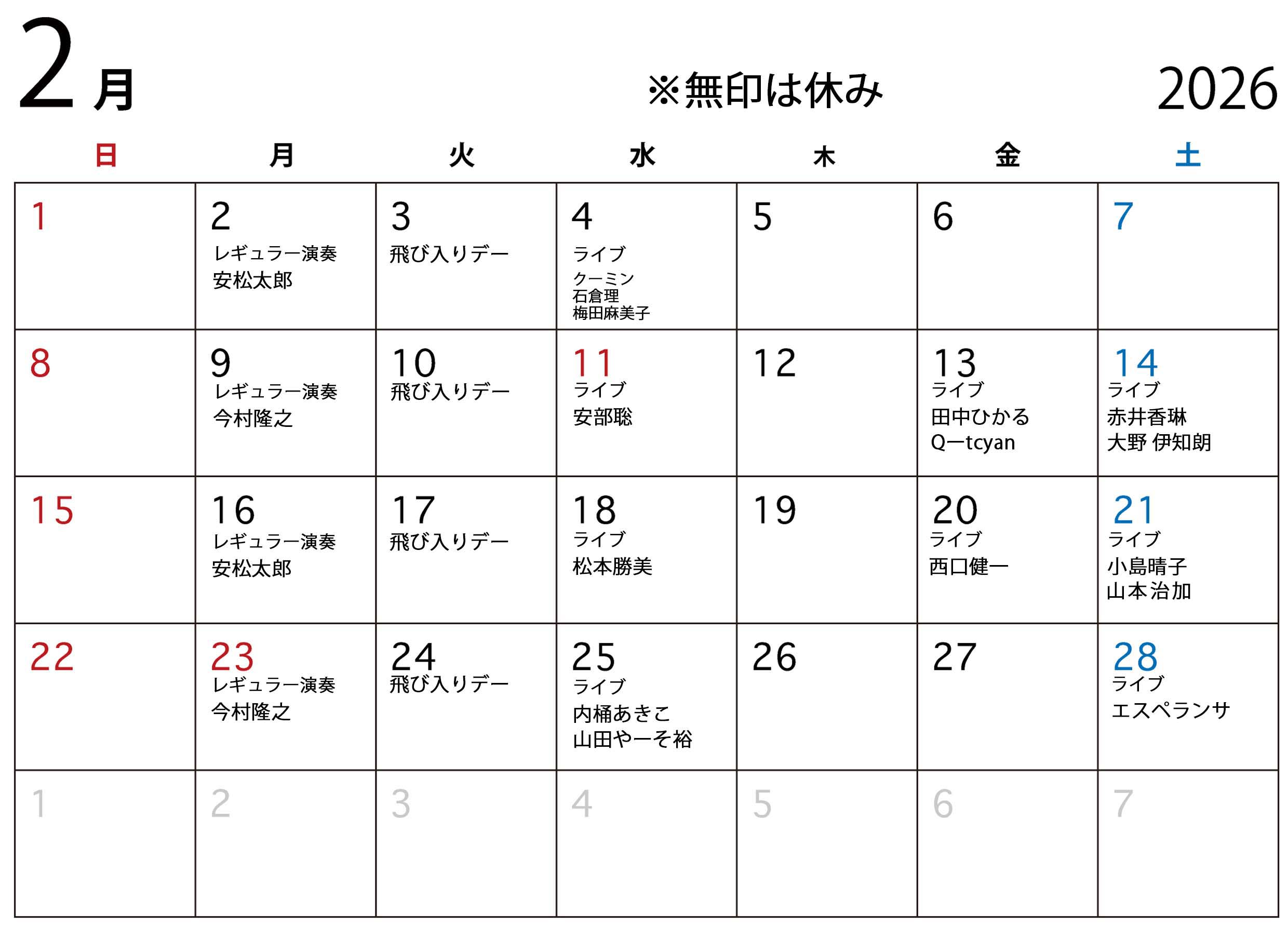 ※2026/2月 のスケジュールをアップしました